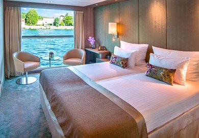 Accommodation on board our ships is some of the finest found on any river cruise ships operated across Europe. We strive to offer you the best with our staterooms and suites, prioritising comfort, space and taste above all else, and giving all the quality of a 5-Star hotel room on water. From enormous windows providing sumptuous views of the passing landscapes, to well-appointed furniture as well as tea & coffee making facilities, every cabin aboard our ships is designed to impress and indulge.