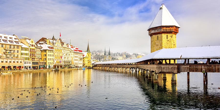 The town of Lucerne itself, with its ornate churches, cobbled streets, colourful Old Town, and famous Chapel Bridge, is a delight to explore. In December you'll be greeted by the cheery traditional Christmas markets, but visit in January and you might catch the Light Festival - an annual celebration that sees special art instillations dotted around the city, all beautifully lit up on an evening.