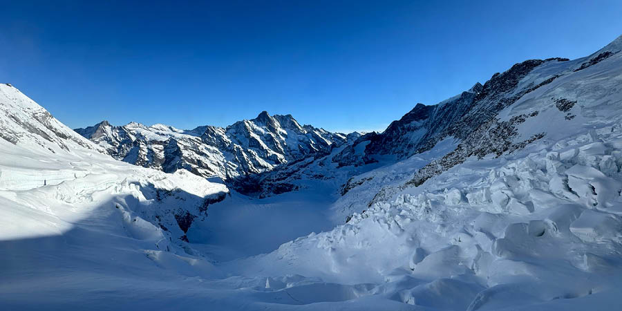 From Eigergletscher station, the famous Jungfrau Railway takes over, climbing through the heart of the mountains to Jungfraujoch, the highest railway station in Europe. Much of the route runs in the tunnel, but the train pauses at viewing windows carved into the rock, offering surreal glimpses out over the ice fields and cliffs that surround the line. I got chance to stand at the front of the train, travelling through the eerie tunnel as it climbs its way up a gradient of up to 1 in 4.
