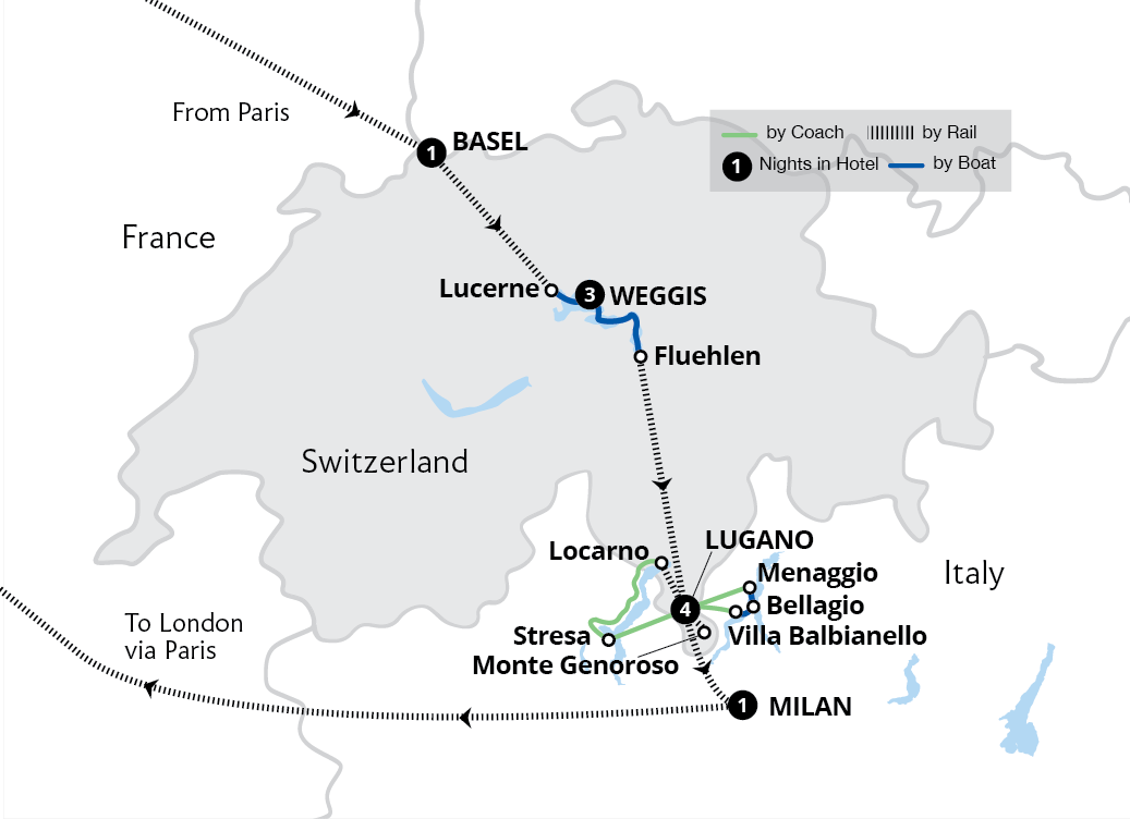 Experience the breathtaking wonders of two countries on one holiday during this spectacular exploration of Switzerland and northern Italy. Discover azure Lake Lucerne from a lakefront hotel in Weggis, including a trip to the summit of Mount Rigi on Europe's first mountain railway. Travelling amid alpine scenery on the iconic Gotthard...